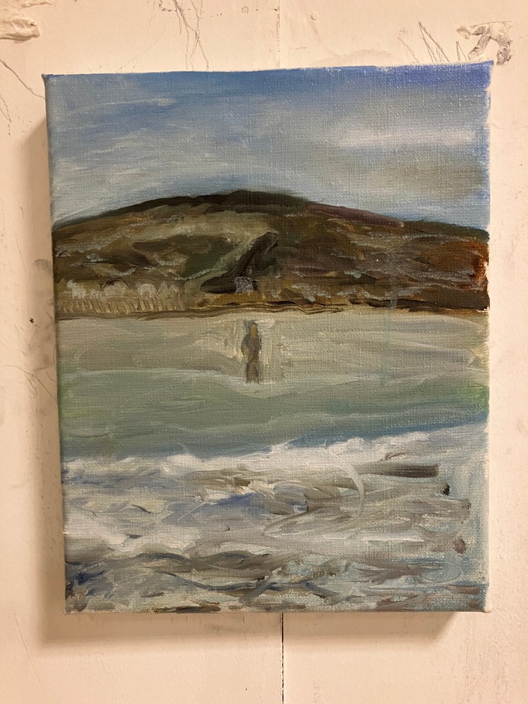 I met another swimmer wearing a wetsuit in the waves Oil on linen 10” x 8 “ $800